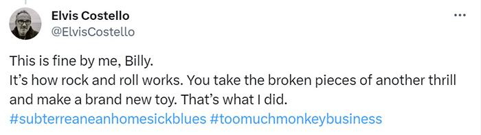 That said, do you know who didn’t give a single shit about those similarities? Elvis Costello. When a Twitter (currently known as X) user pointed it out, Costello replied thusly: