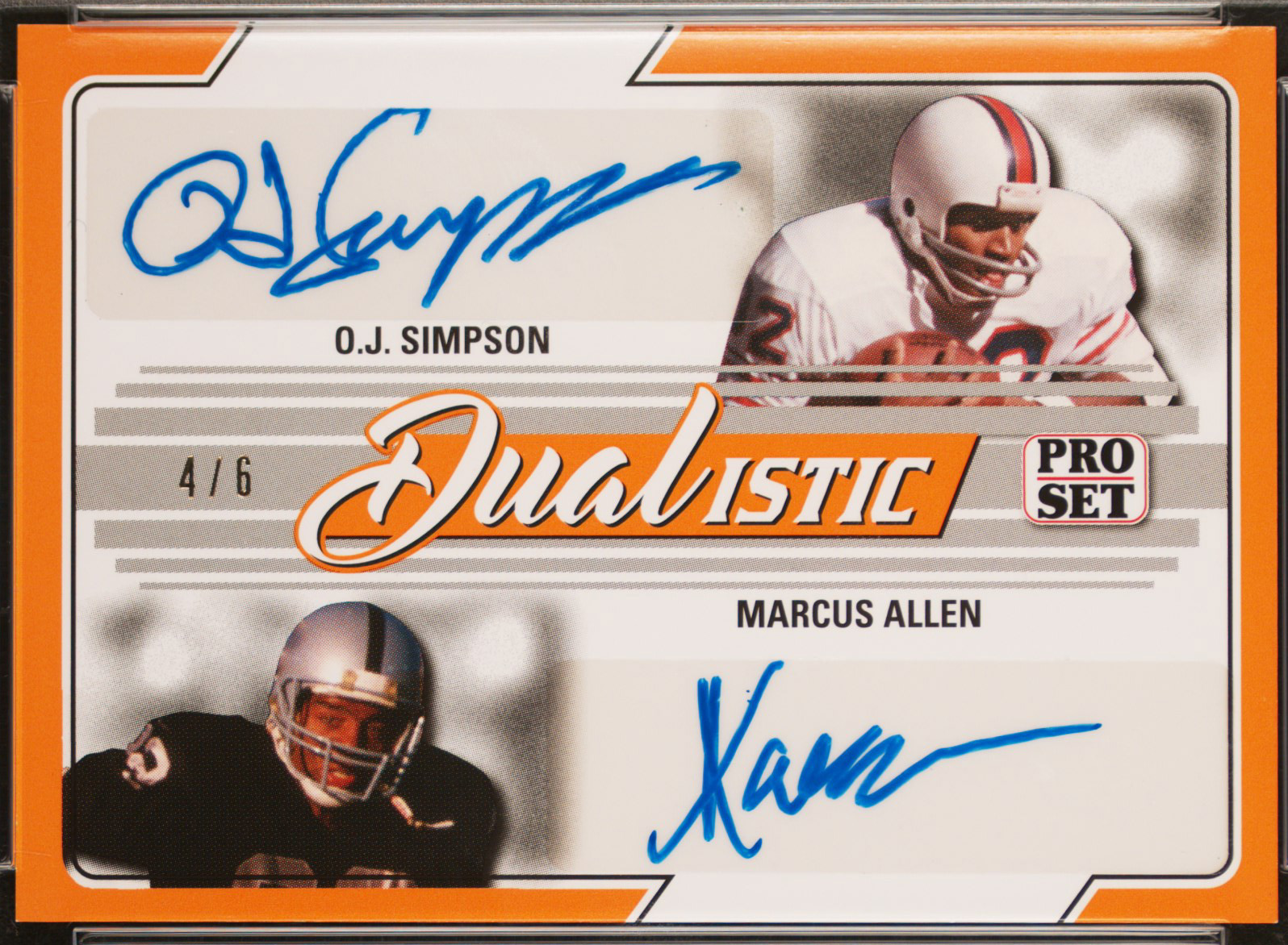 If you’re surprised these two would even sign the same card, look a little closer at that picture. With a lot of signed sports cards, the players just sign a bunch of pieces of tape and that tape is applied to cards later. That’s what happened here. There’s a decent chance O.J. Simpson and Marcus Allen just signed a bunch of stickers and had no idea this card was going to be produced.